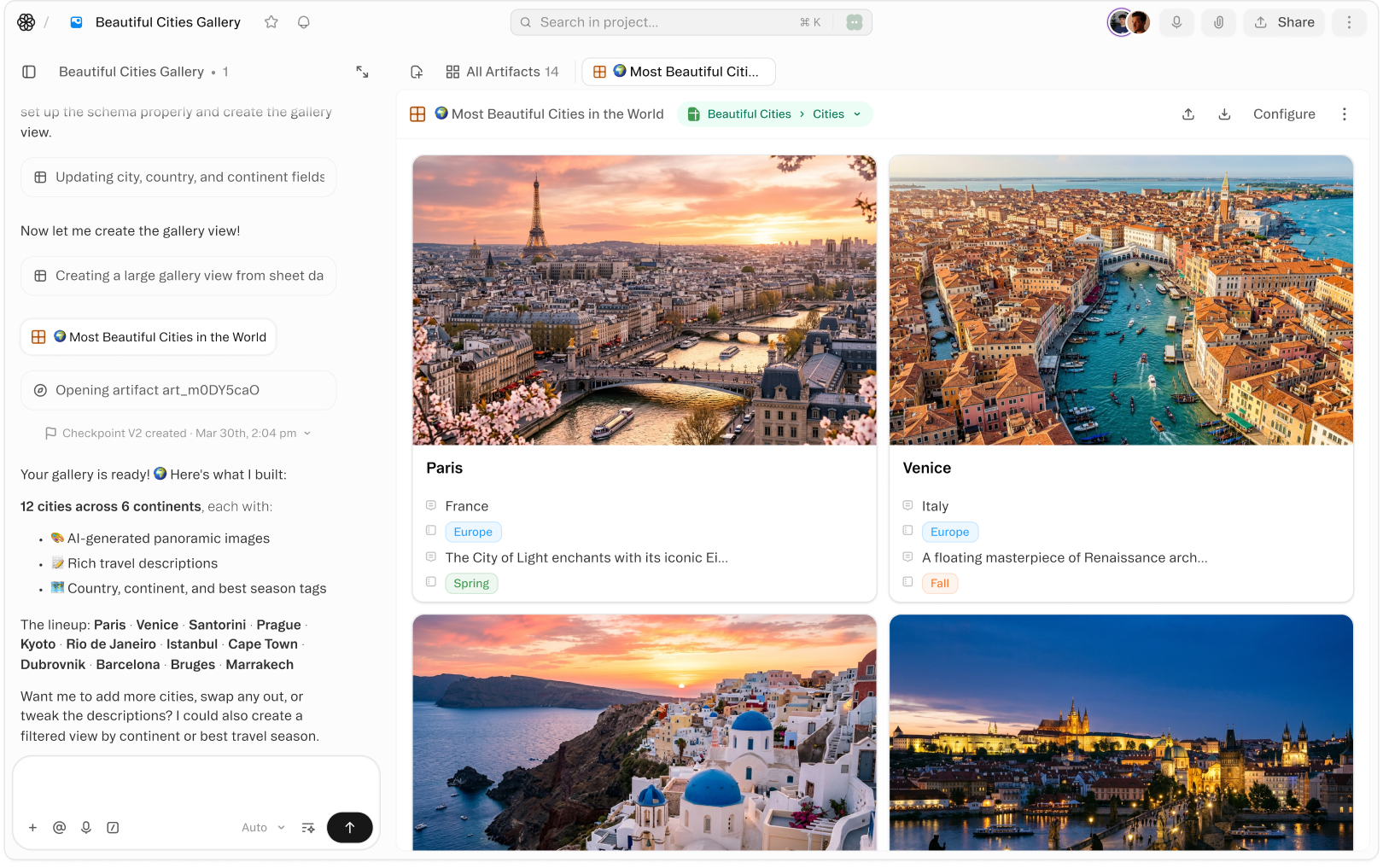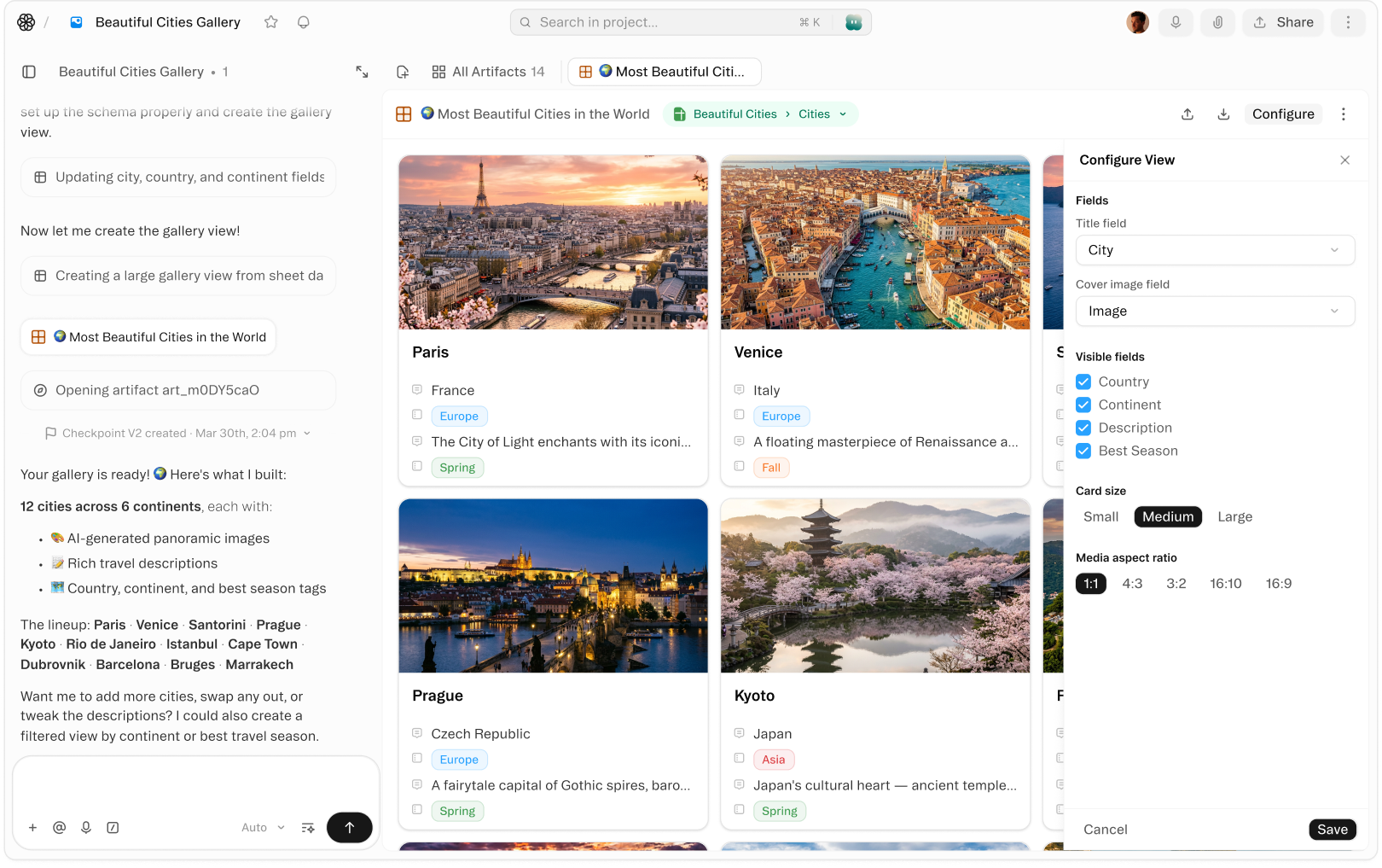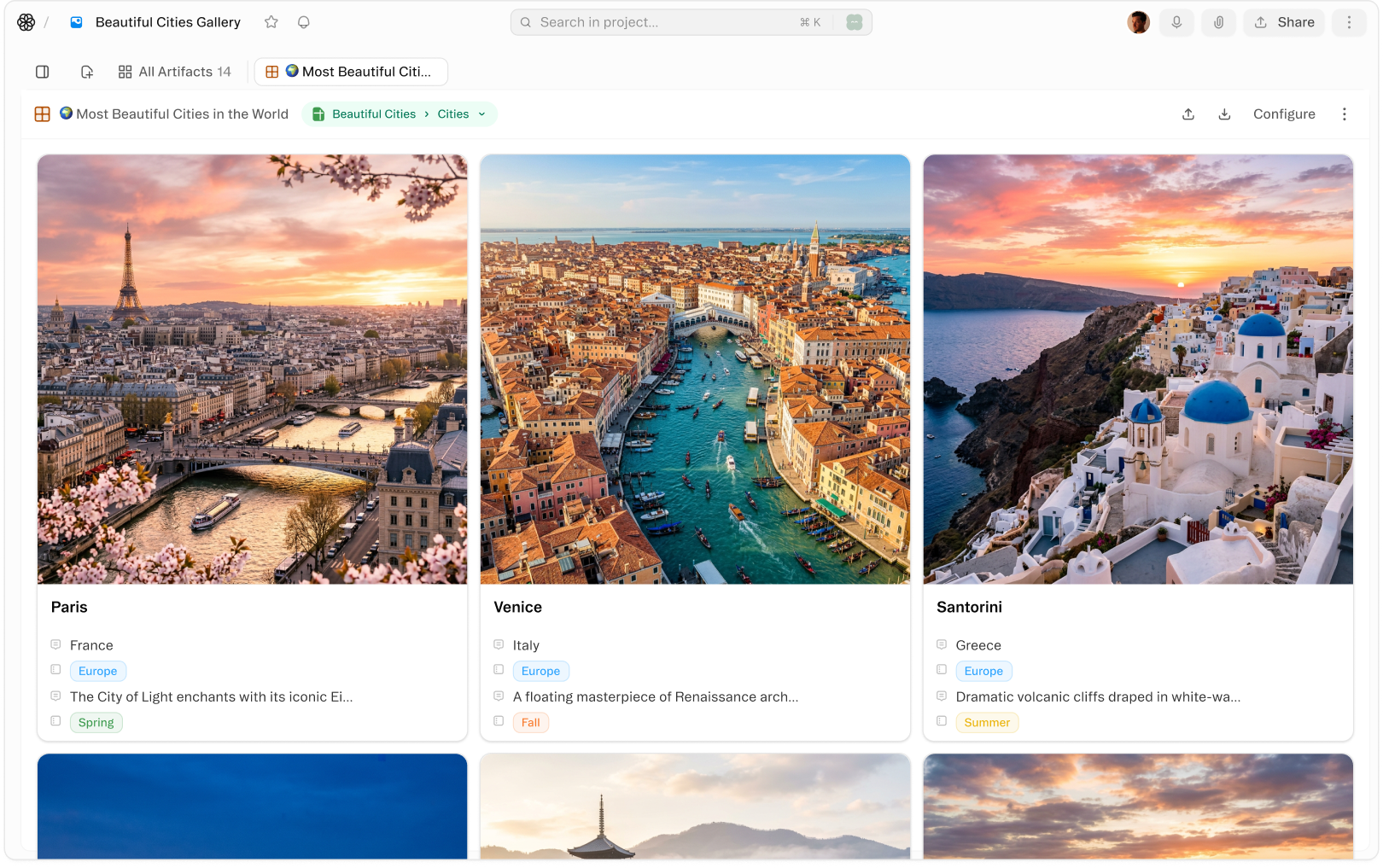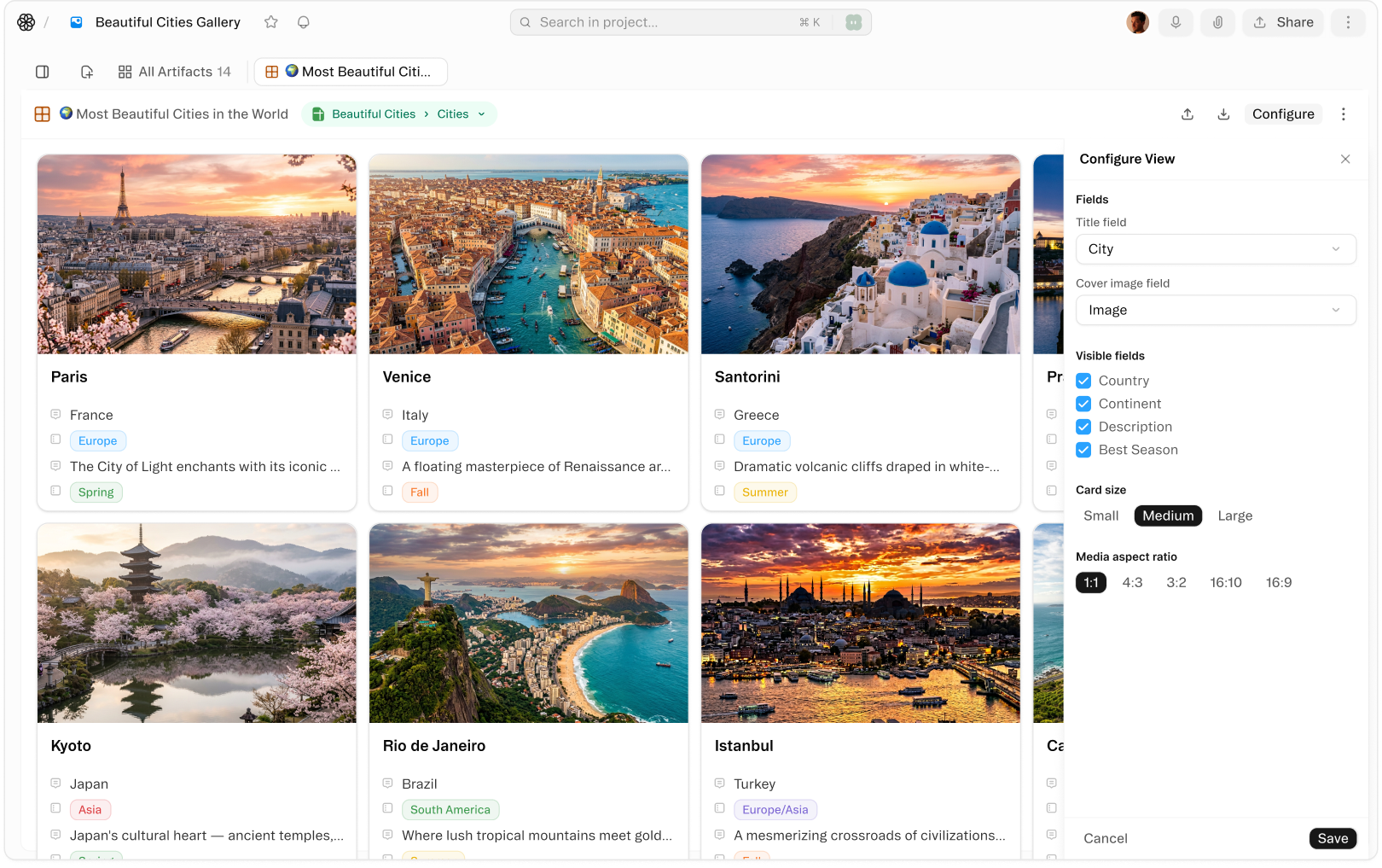 Turn any sheet into a visual card grid — ideal for product catalogs, content libraries, image datasets, and portfolio management. Cover images pull automatically from your records, making it easy to browse at a glance.