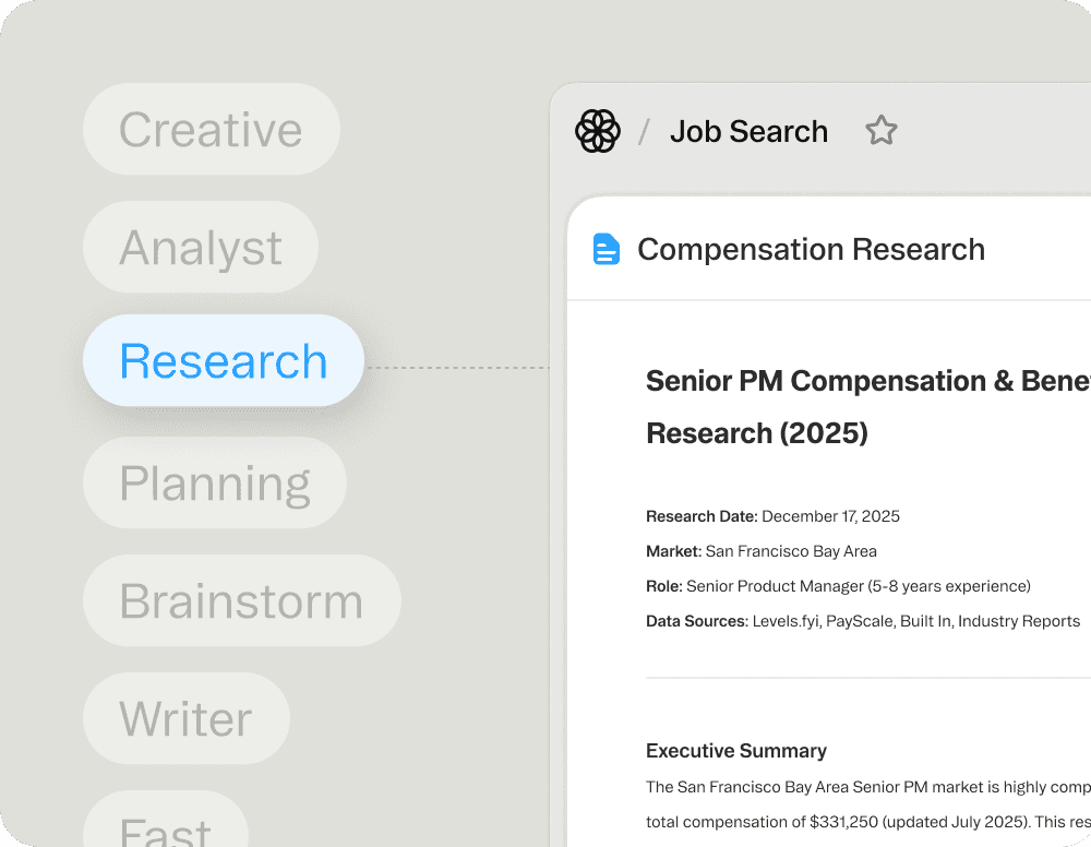 Whether you’re researching market compensation or a target company, Research Mode is ready to dig deep.