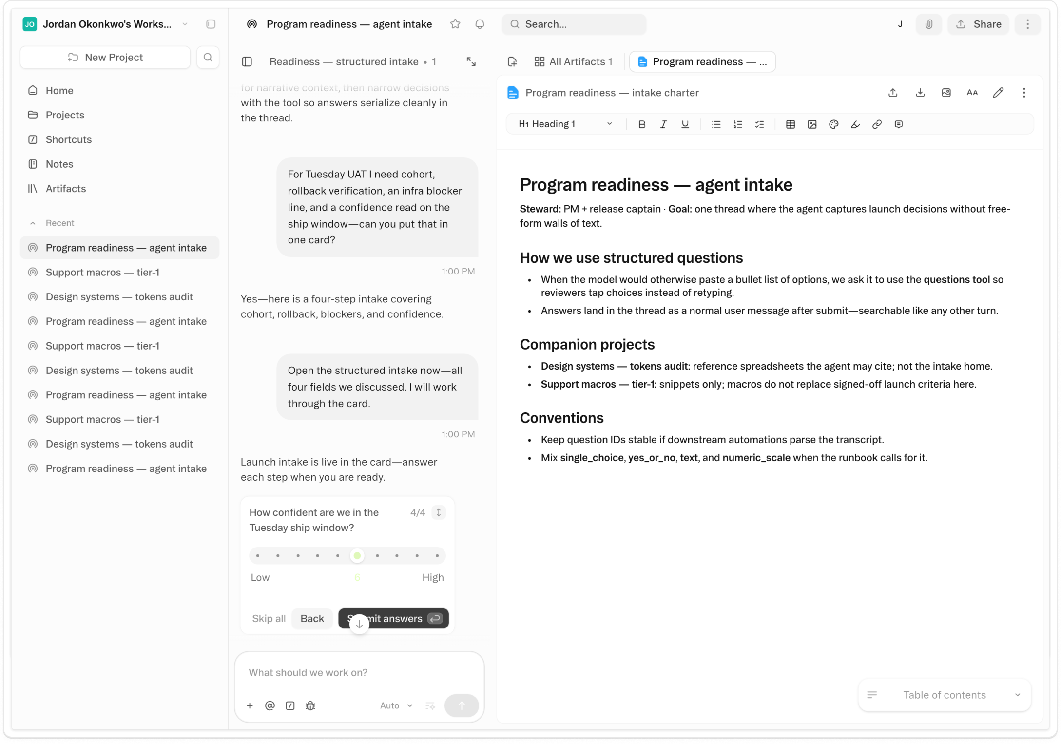 When the Obvious agent needs information before starting meaningful work, it surfaces a Questions card in the chat window. Each question is formatted to match the kind of answer it needs — a yes/no toggle, a single-choice picker, a multiple-choice list, a 1–10 scale, an ordering interface, or a short text field. Recommended answers come pre-filled: the agent's best guess based on what it already knows. You accept, adjust, or skip the card entirely and let the agent proceed on its own assumptions.