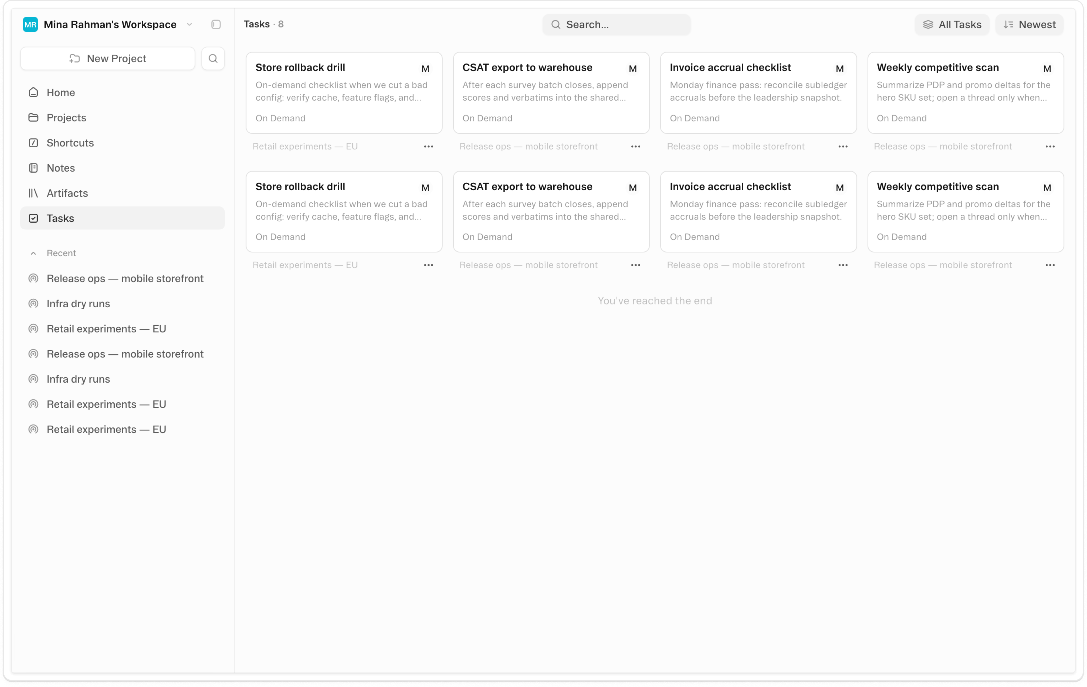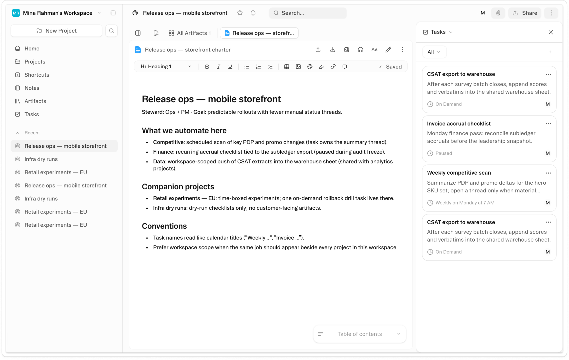 The weekly status pull. The candidate screen. The lead follow-up cadence. The competitive digest that should be ready before Monday's sync. Each one takes ten minutes. Each one needs you to show up and ask. Tasks is the mechanism for transferring those workflows to the agent — specified with enough precision that the output is right, running on the schedule that makes sense, without requiring your attention every time.