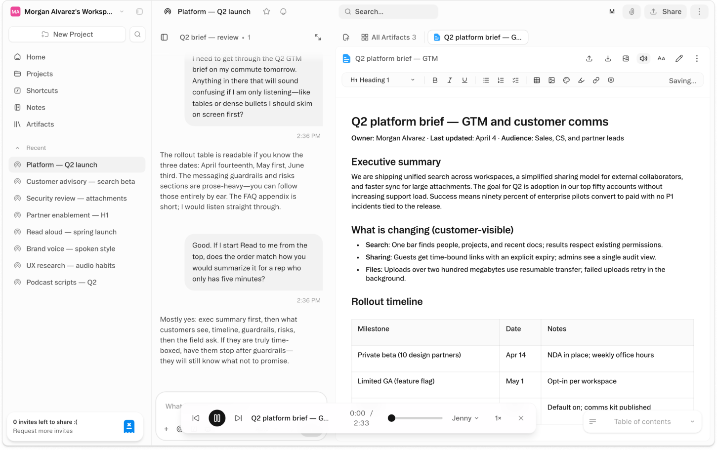 Documents generated in Obvious — research briefs, strategy memos, meeting summaries — have always been useful. Read Aloud makes them useful when you're not at a desk, not looking at a screen, not able to give them your full visual attention. The commute counts. The walk counts. The ten minutes between calls counts. Read Aloud is the first step toward a version of Obvious that doesn't require you to be sitting still.